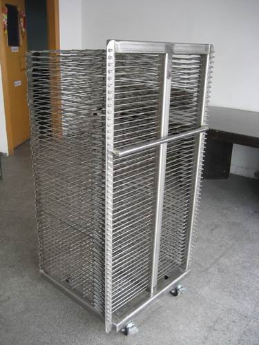 千層架,又叫(jiào)絲印千層架、乾燥架、千層車、晾曬架、晾紙架、網架(jià)、層架台車。適用(yòng)於印刷(shuā)、上膠、噴漆、上色,濺鍍(dù)後的晾乾置放器材。活動式(shì)多層網格設計,置放空間大,操作方便,節省車間、庫房麵積,並可適用於所放產品的常溫(wēn)晾乾和進焗爐高溫烘烤。 使用的材(cái)料有(yǒu)不鏽鋼(gāng),碳鋼等。 主(zhǔ)架一般采用角鋼製作(zuò),表麵處理有噴漆/烤漆/電鍍鋅; 網(wǎng)片采用2-12MM的線材製作,表麵處理的方式有電鍍彩鋅,噴塑(也叫包(bāo)膠,用於防止產品劃傷采取的一種表麵處(chù)理(lǐ)方式)。
