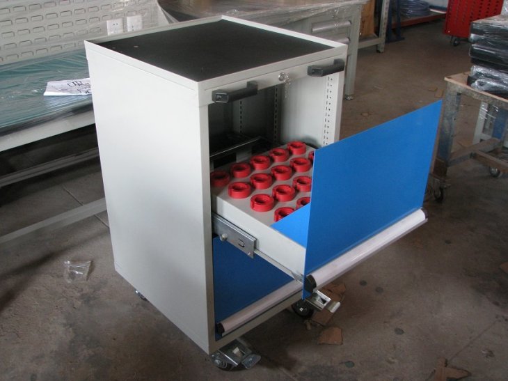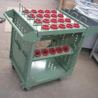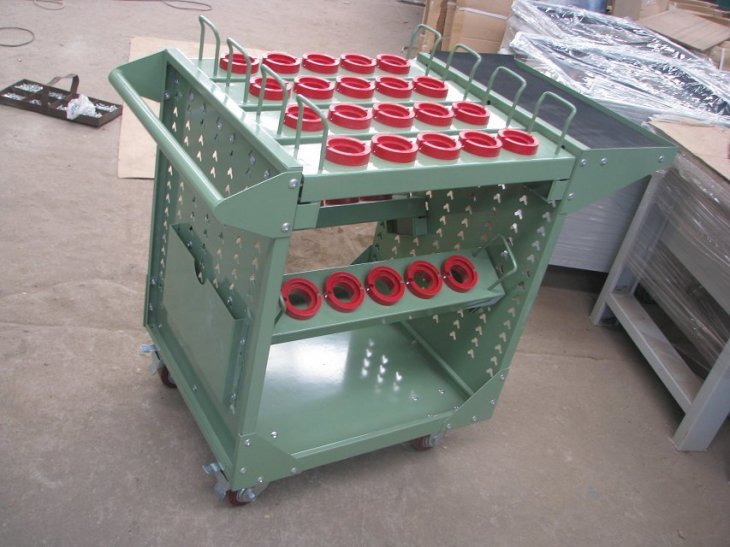 刀具車(chē)是存放、搬運刀(dāo)具的裝備,現代貨(huò)架廠生產的HY-HSK係(xì)列刀具(jù)車成多邊成型的前後側板上有模數化的人字孔,可將刀具座掛板按水平或傾斜放置,方便多種刀具的存放。 高強度腳輪,車前為兩個定向輪(lún),車後為兩個萬向帶 刹車(chē)輪,推行平(píng)穩,方向性好,刹車固定後不會滑動。 結構(gòu)特點(diǎn): 1.配有標簽,明確分類(lèi). 2.快速拿出工(gōng)具,節(jiē)約查找時間. 3. 配有輪(lún)子(zǐ),便於移動. 4.抽屜可拉出100%